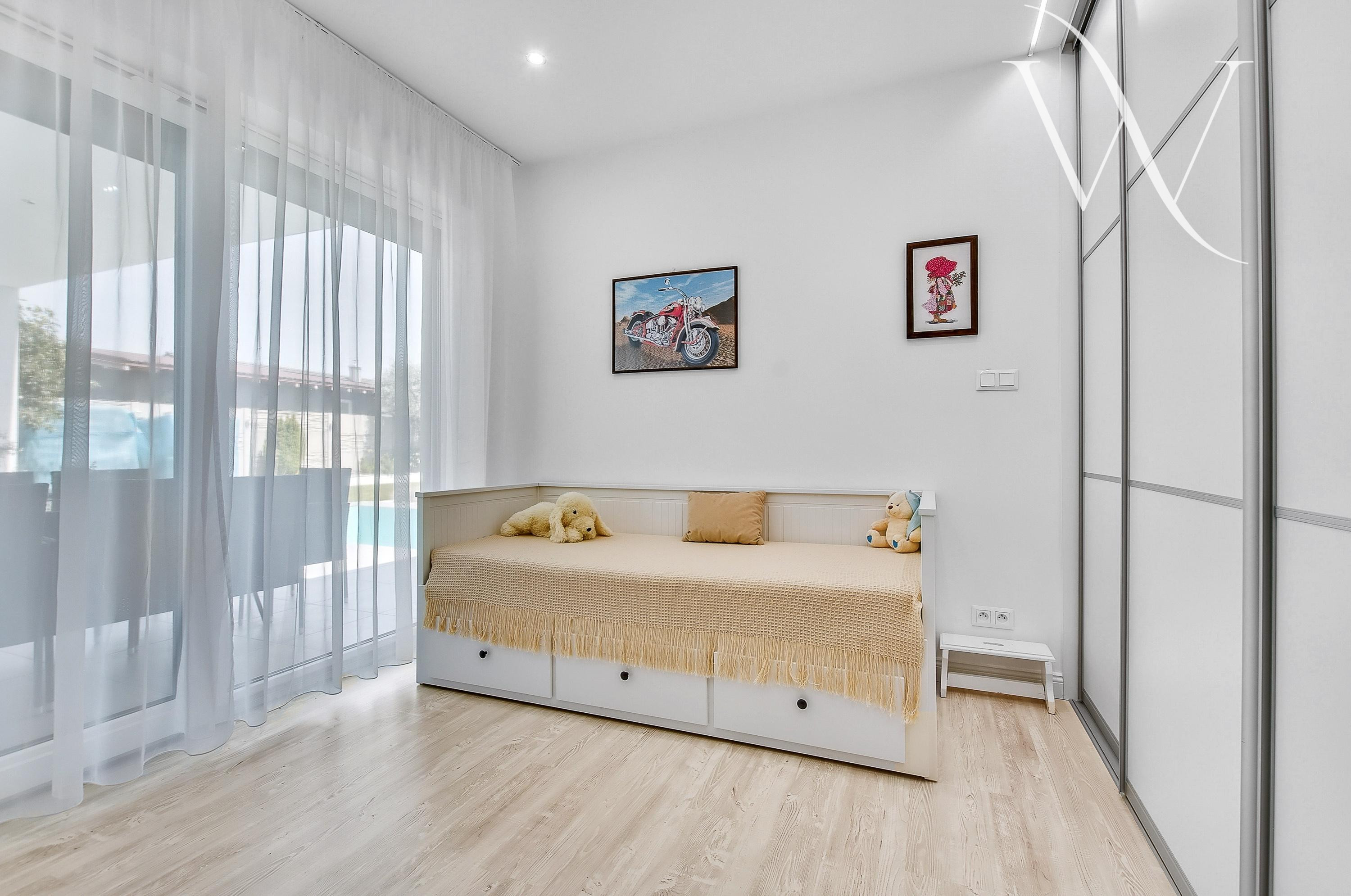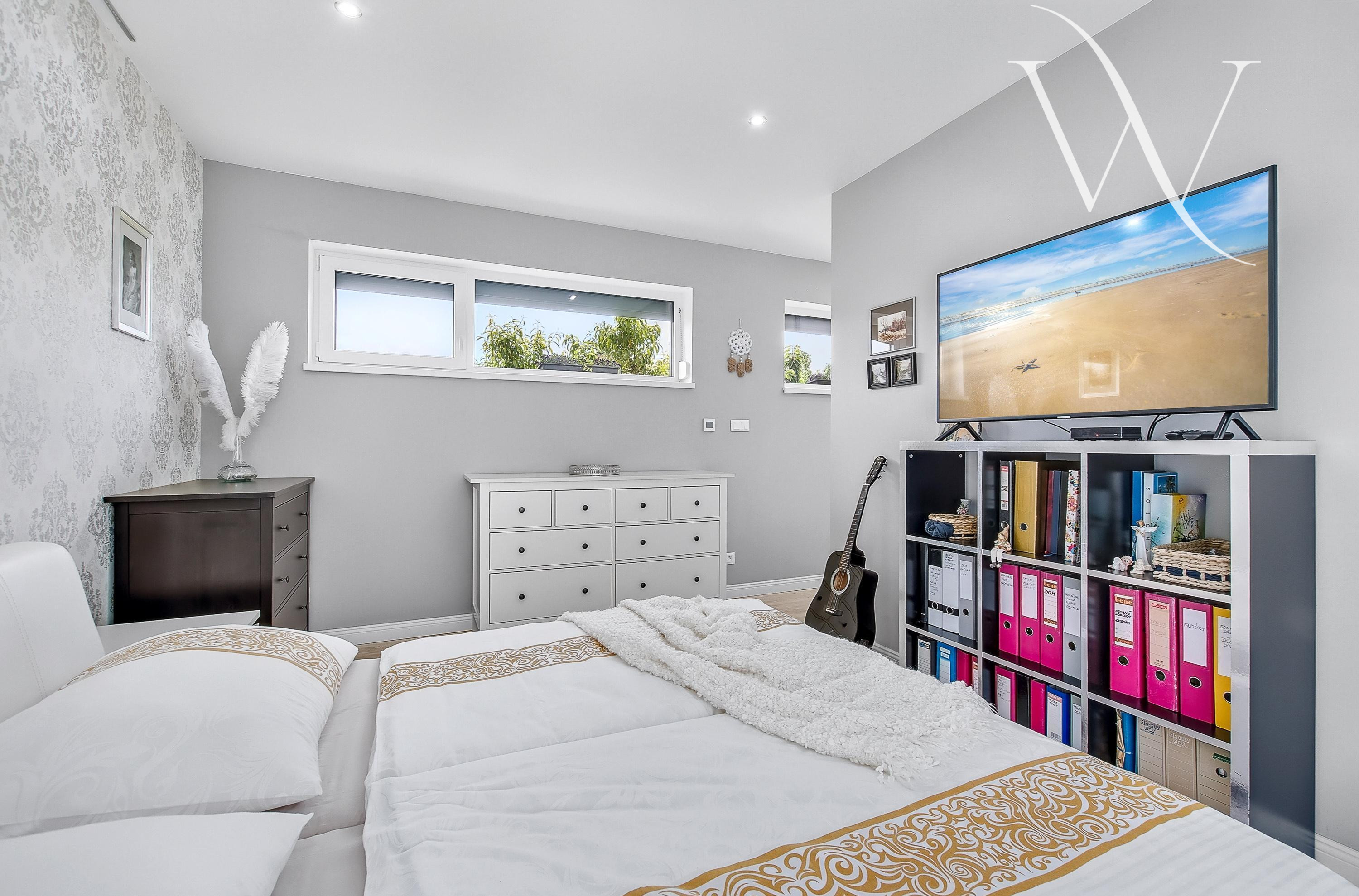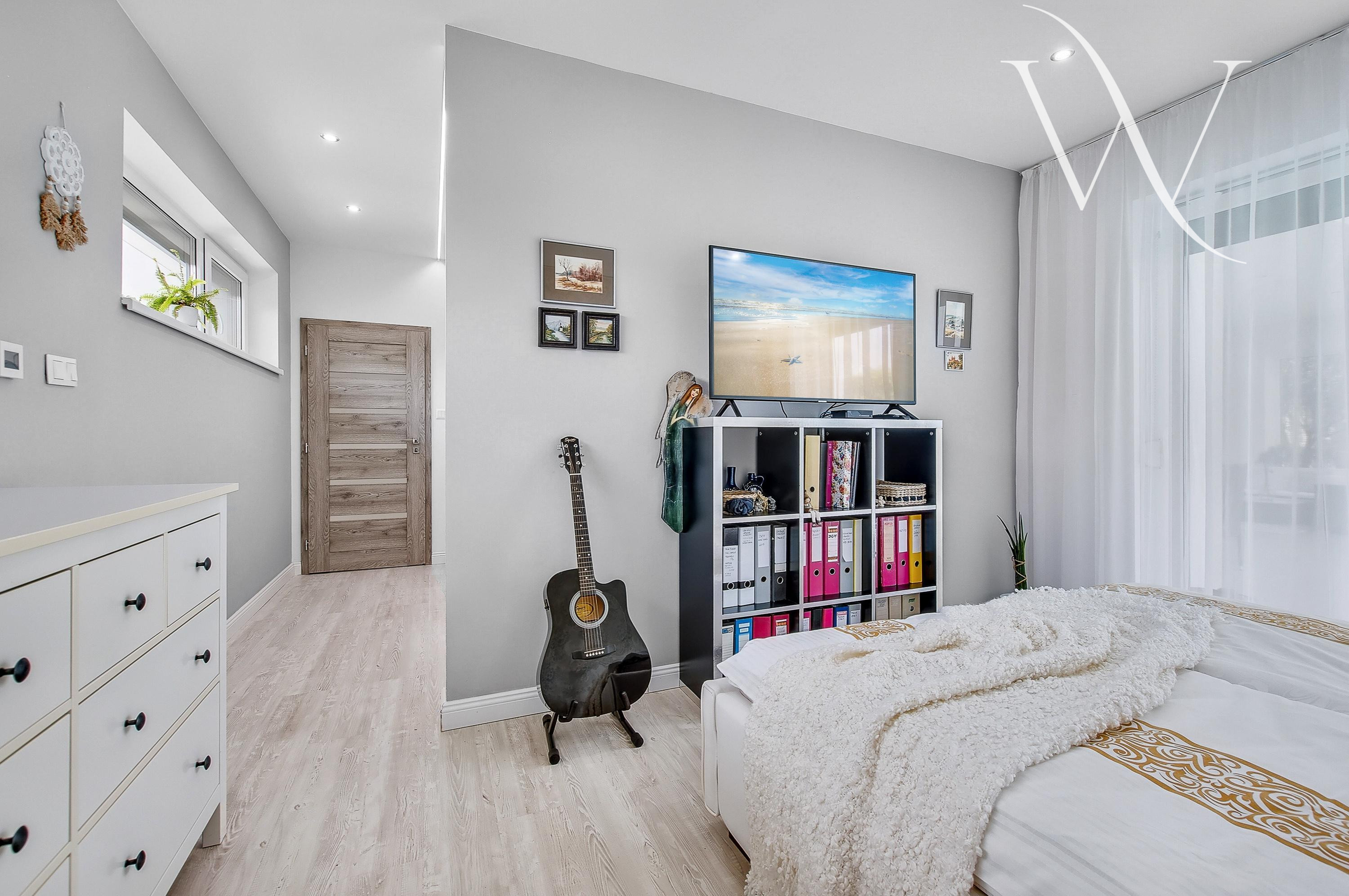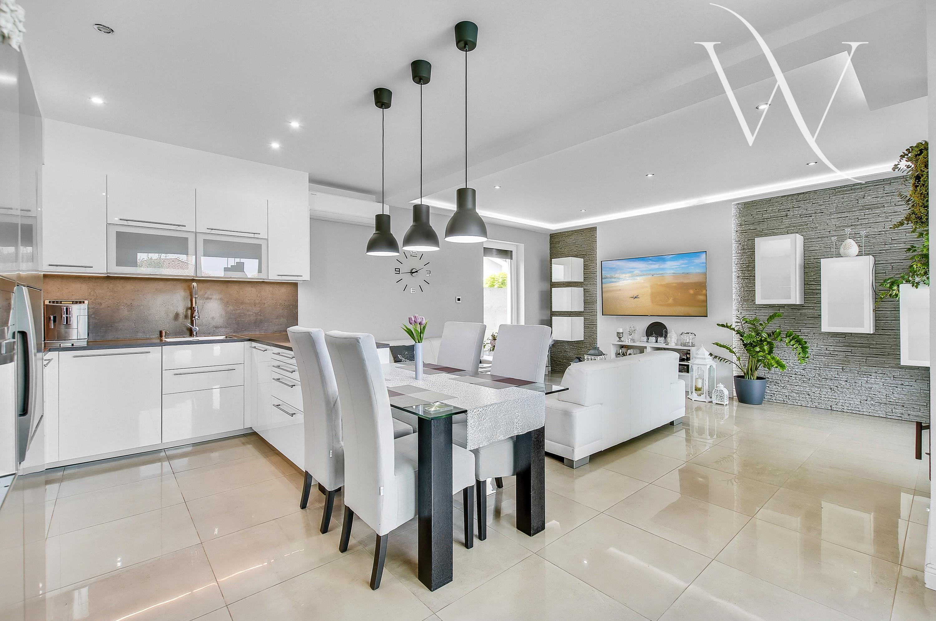 Dispozícia domu pozostáva zo vstupnej haly s rozlohou 12,95 m², obývacej izby s kuchyňou o veľkosti 38,72 m² s priamym výstupom na terasu, hlavnej spálne s plochou 19,41 m², dvoch samostatných izieb s výmerami 10,41 m² a 9,00 m², kúpeľne o veľkosti 5,49 m², samostatného WC s rozlohou 1,71 m² a technickej miestnosti / skladu s výmerou 2,00 m².