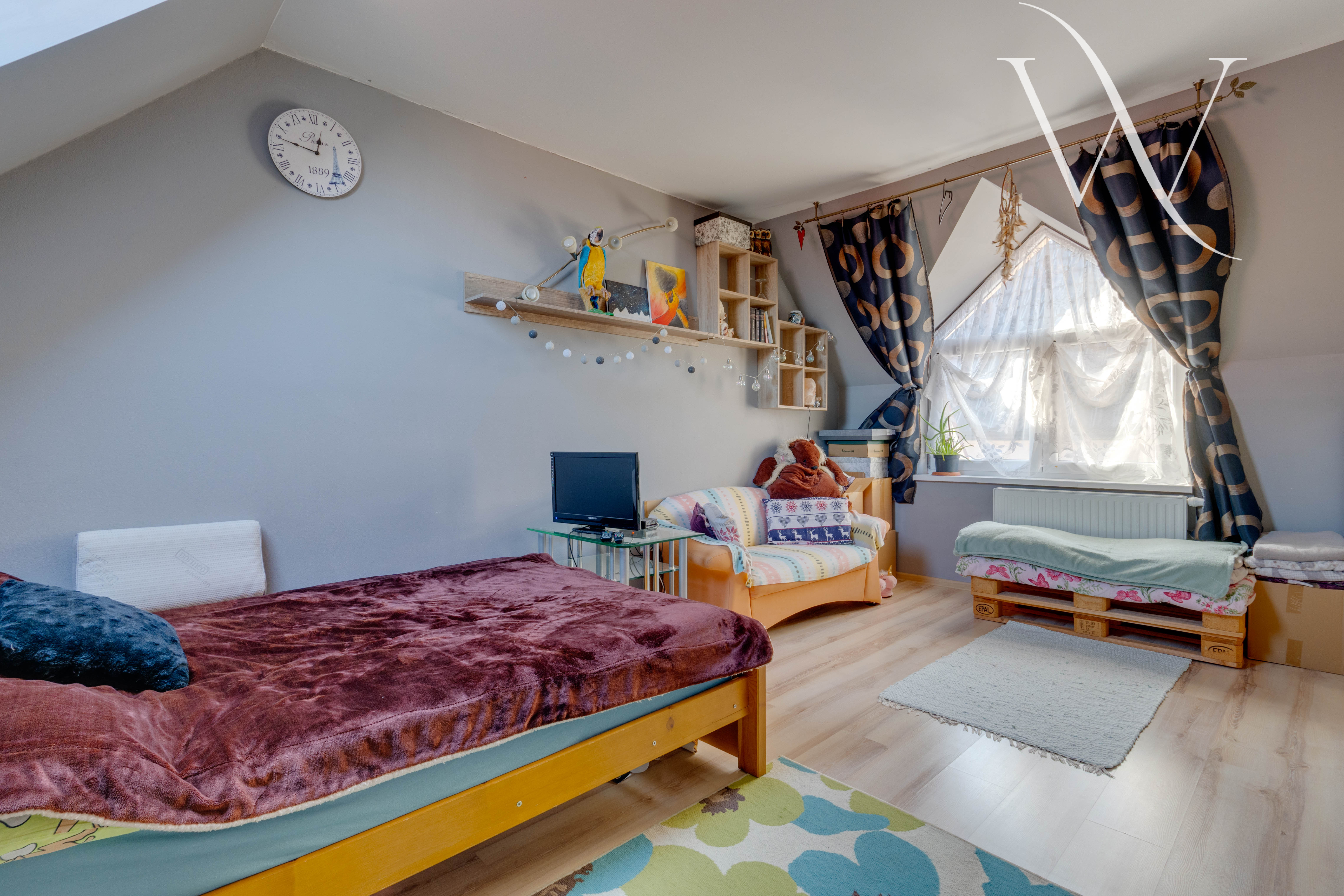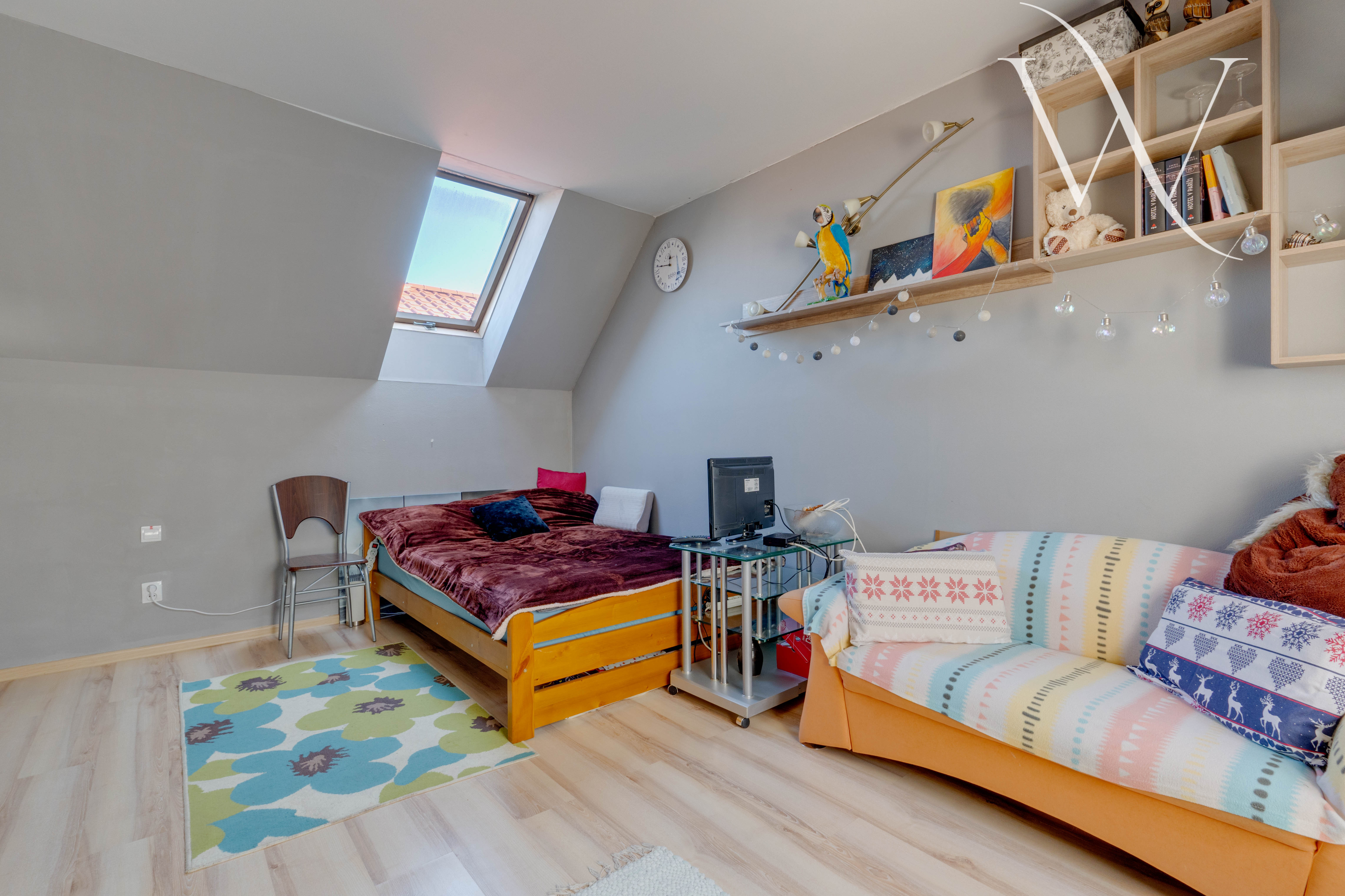 2. NP (59 m²): Dreveným schodiskom sa dostaneme do chodby, ktorá spája dve samostatné izby – priestranná spálňa s veľkým rolldorom a druhú izbu, ktorú je možné využiť ako detskú izbu alebo pracovňu.