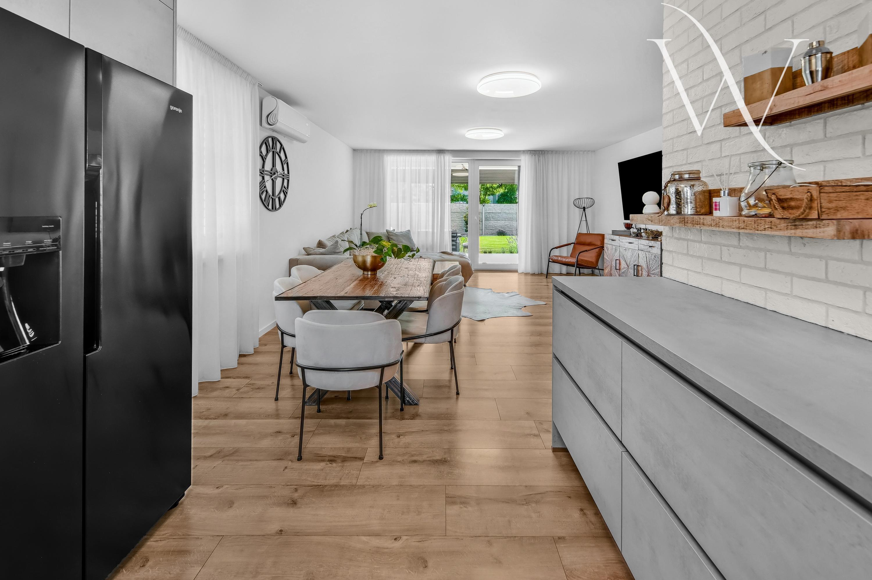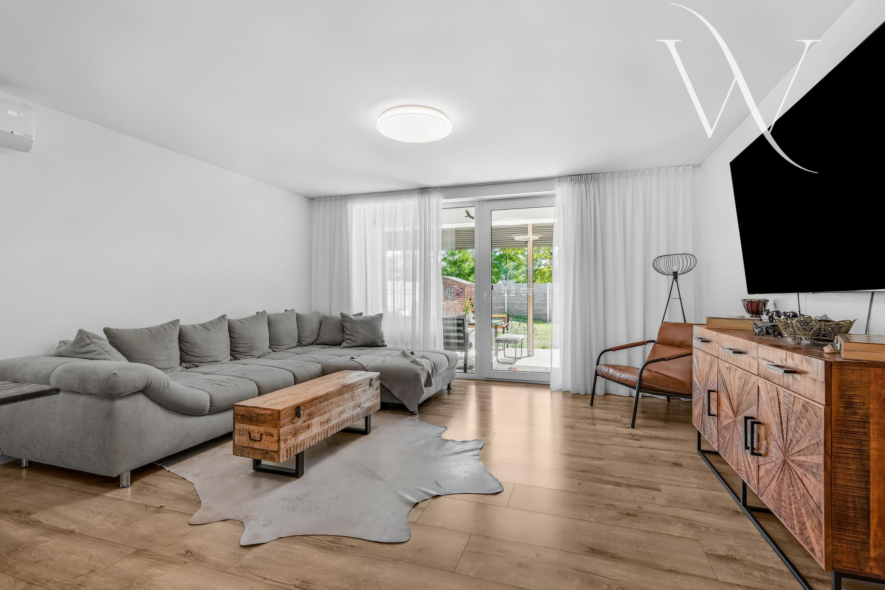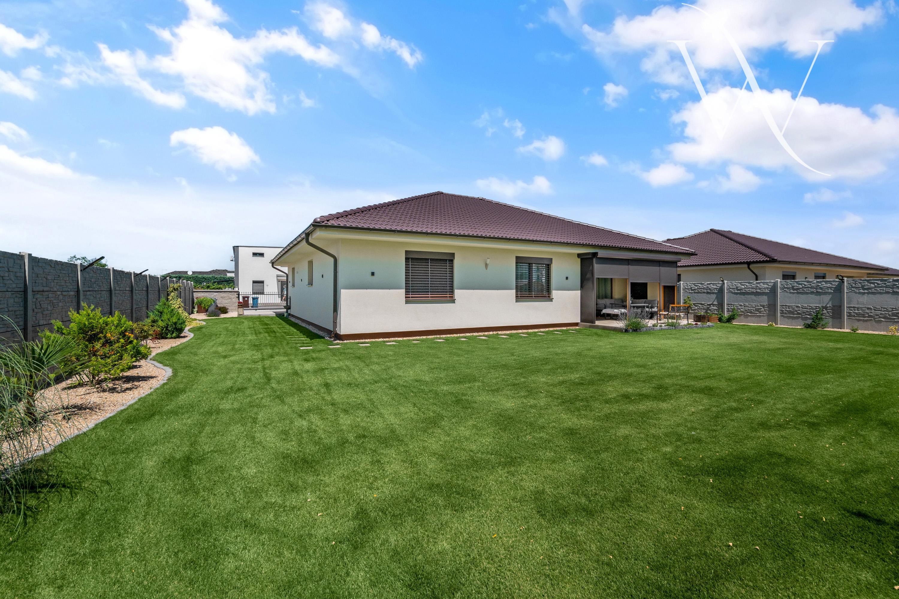 Dominantou domu je veľkorysá, vzdušná obývacia izba prepojená s kuchyňou a jedálňou. Z obývačky je výstup na prestrešenú terasu a do krásne udržiavanej záhrady – ideálne miesto na rodinné stretnutia či oddych.