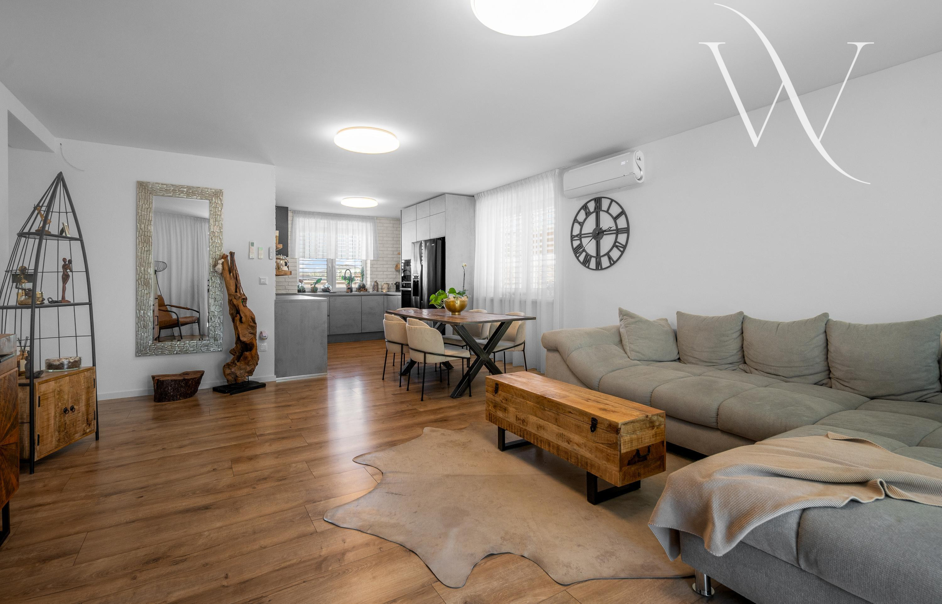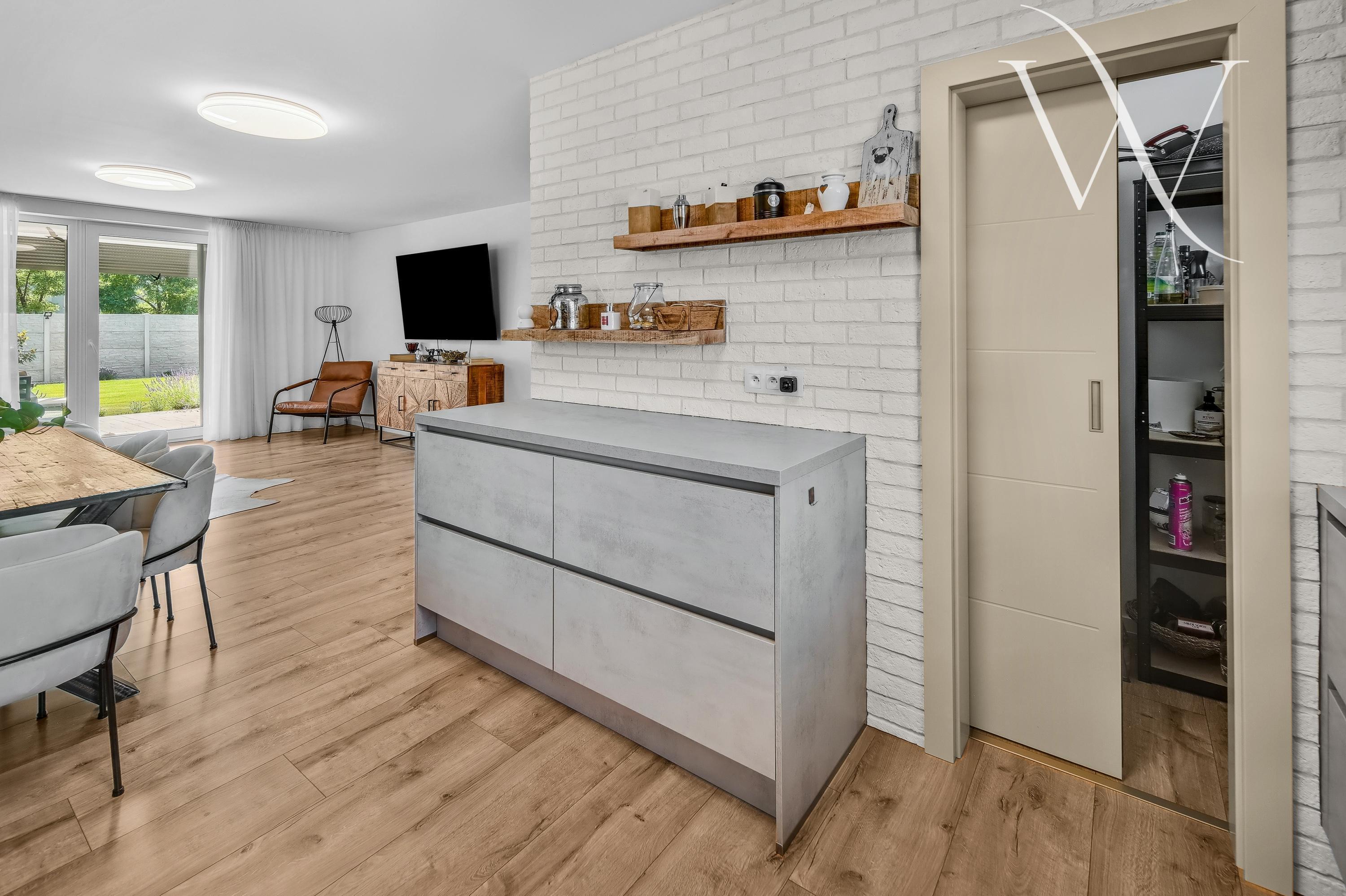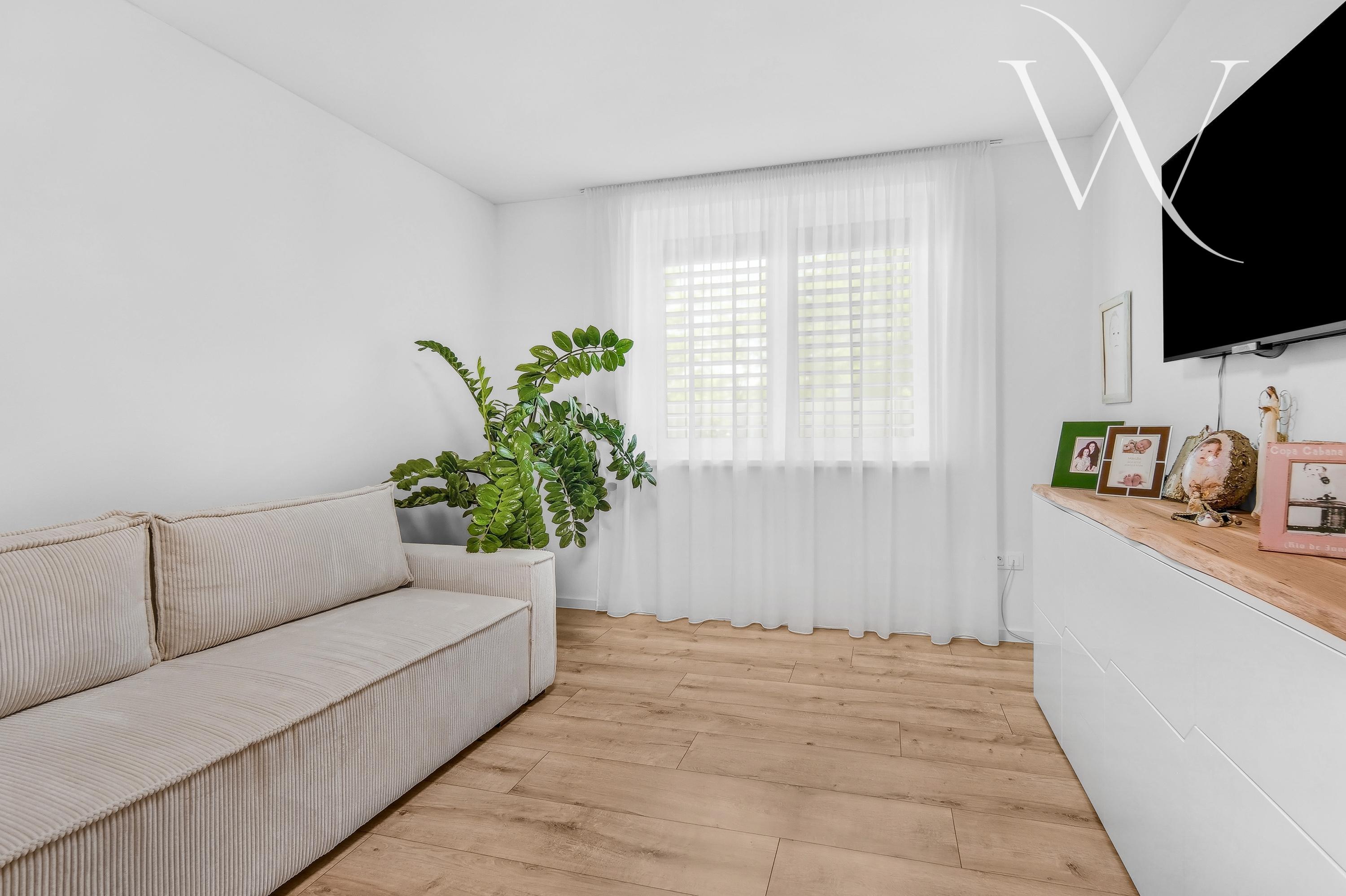 Dominantou domu je veľkorysá, vzdušná obývacia izba prepojená s kuchyňou a jedálňou. Z obývačky je výstup na prestrešenú terasu a do krásne udržiavanej záhrady – ideálne miesto na rodinné stretnutia či oddych.