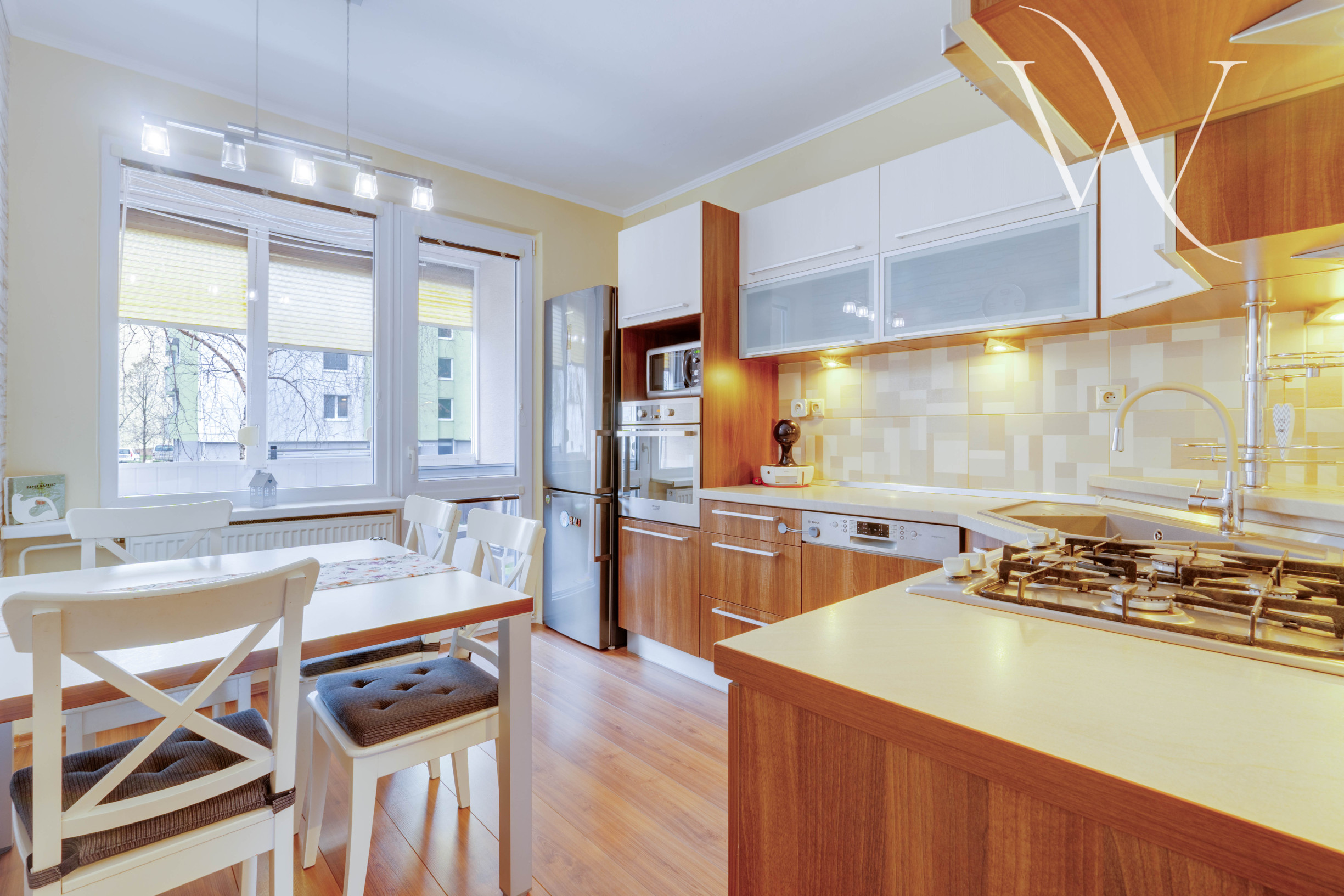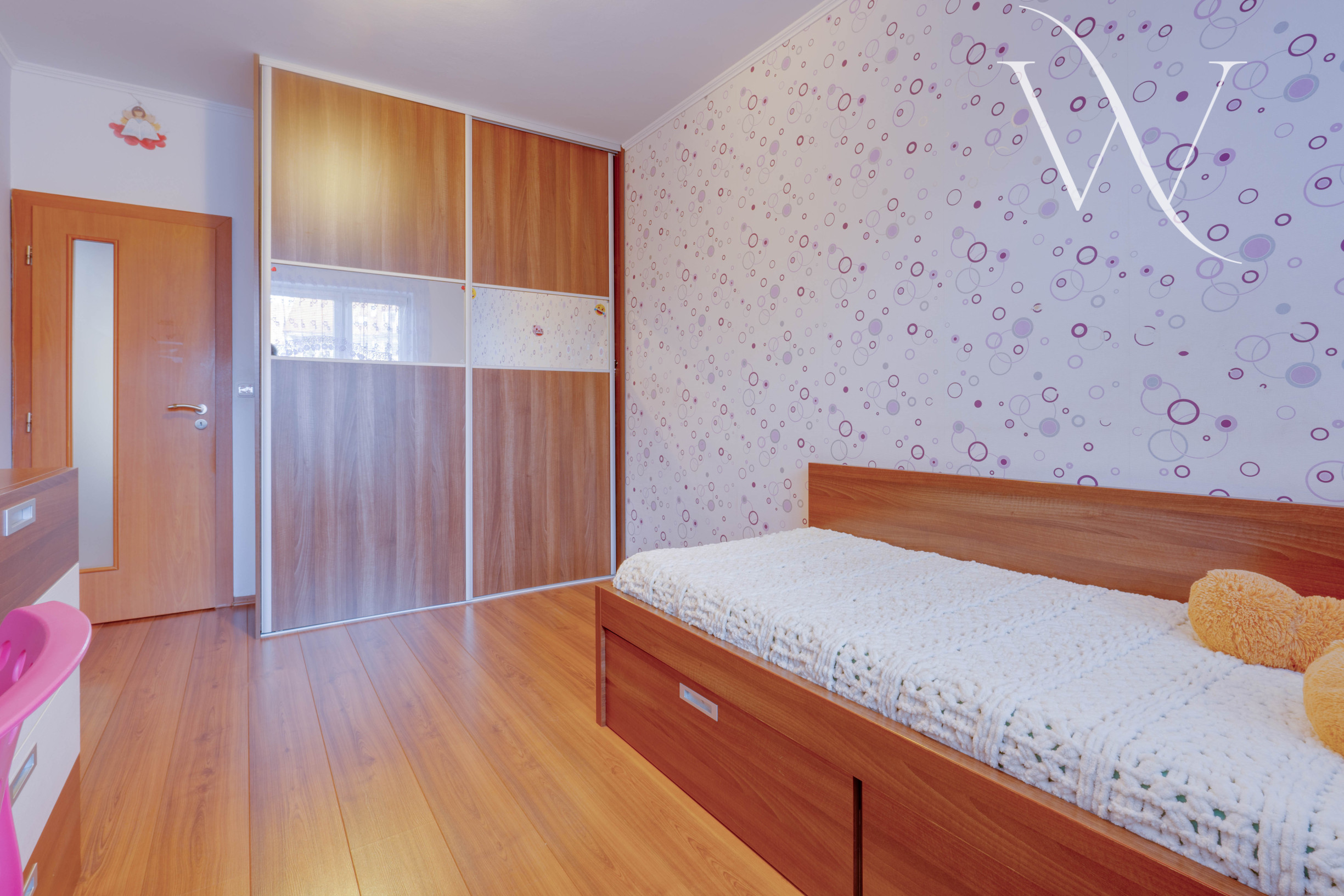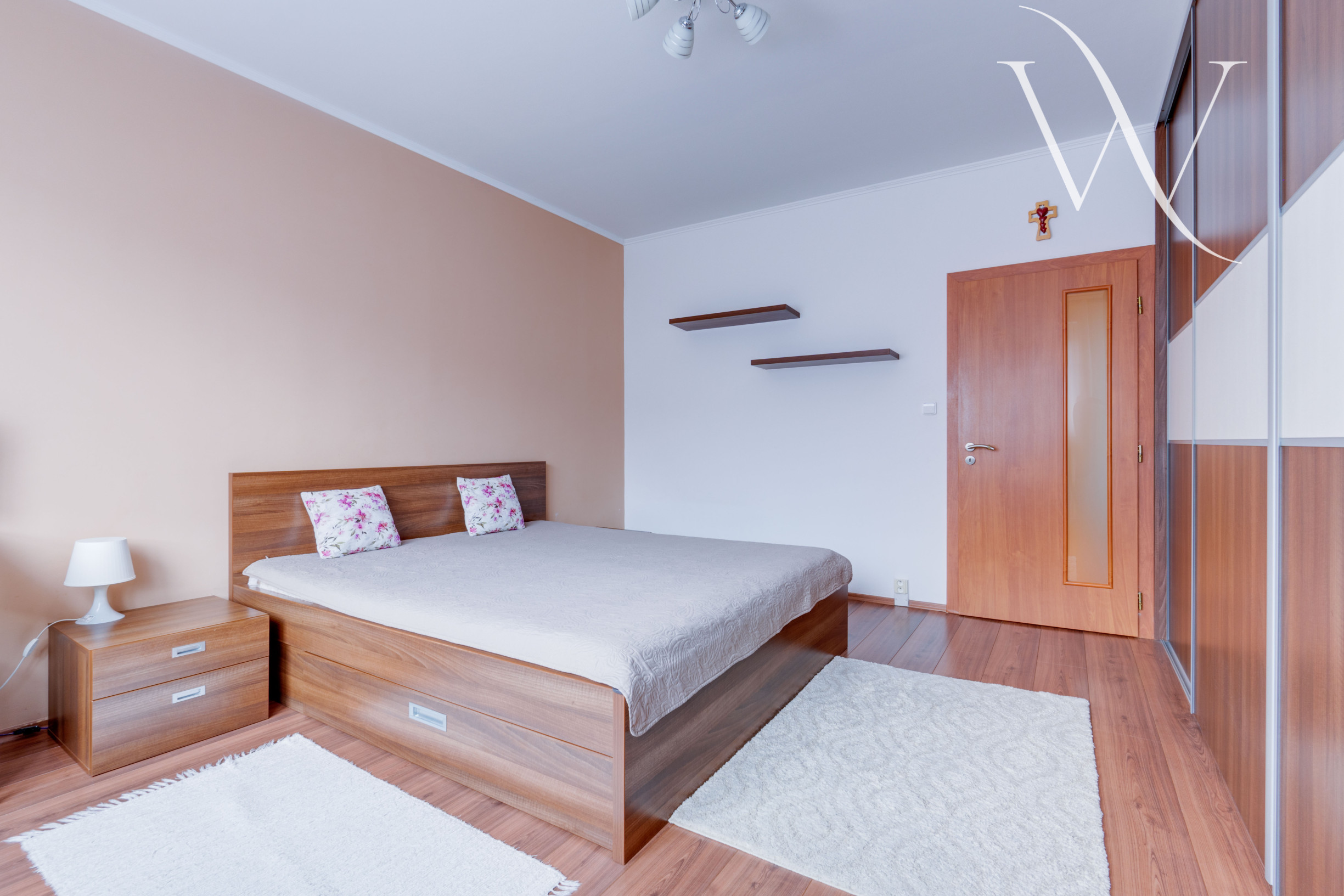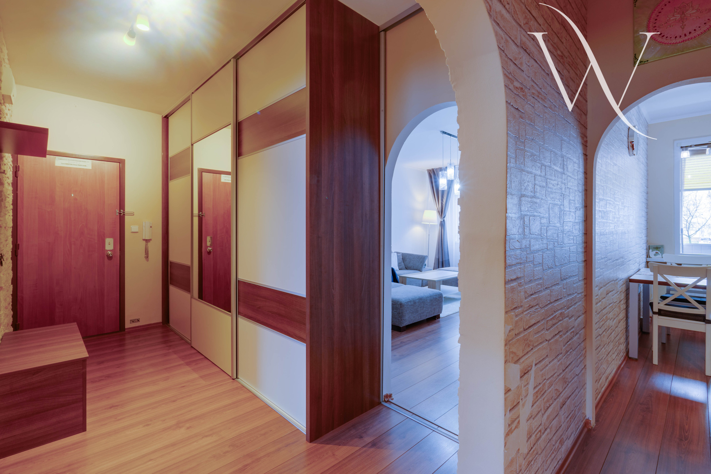 Pri vstupe do bytu sa nachádza priestranná chodba s úložnými priestormi. V celom byte veľké množstvo úložných priestorov vo forme vstavaných skríň. Po pravej strane sa nachádzajú 2 izby, ktoré slúžia ako spálňa a detská izba. Po ľavej strane sa nachádza priestranná obývacia izba. Kuchyňa je samostatná a vedie z nej priamy výstup na lodžiu. Kuchynská linka je plne vybavená spotrebičmi a poskytuje dostatok úložného aj pracovného priestoru. Kúpeľňa s vaňou je spojená s toaletou. Byt prešiel čiastočnou rekonštrukciou v roku 2013.