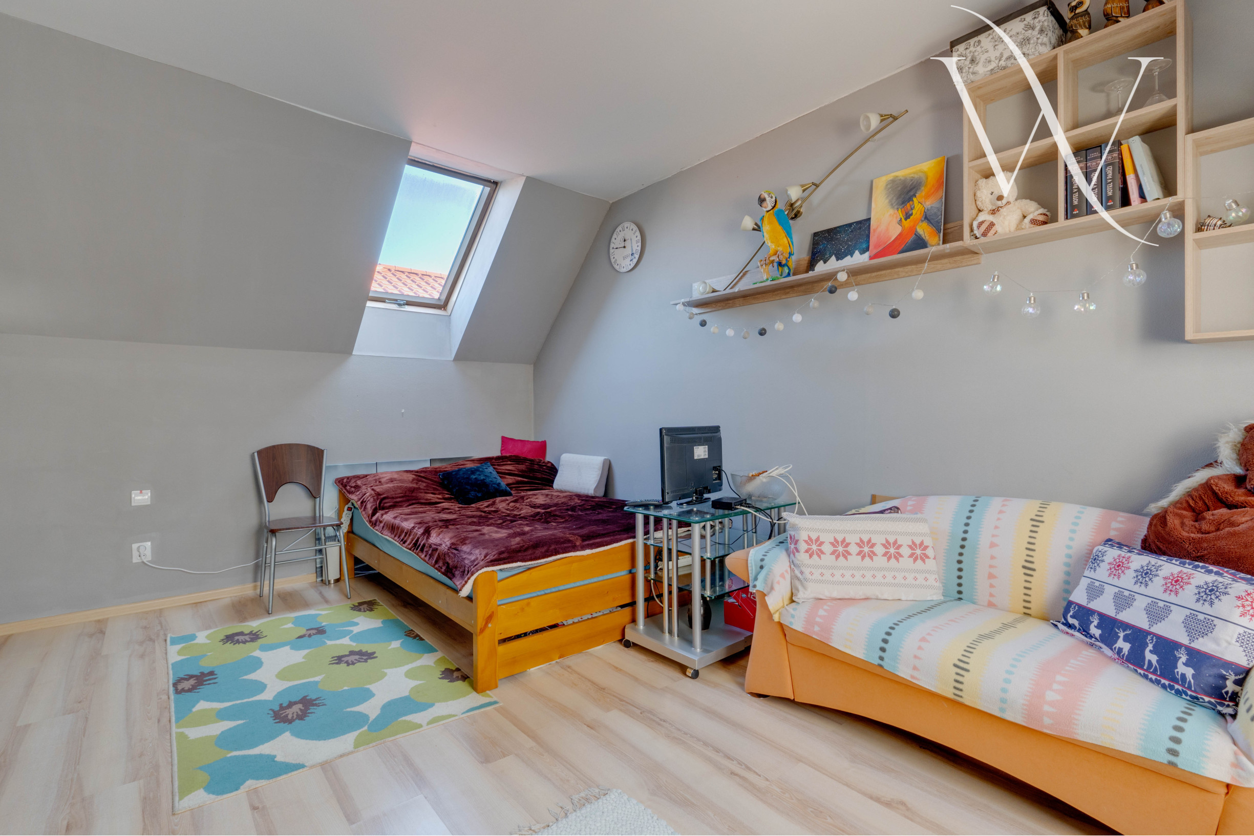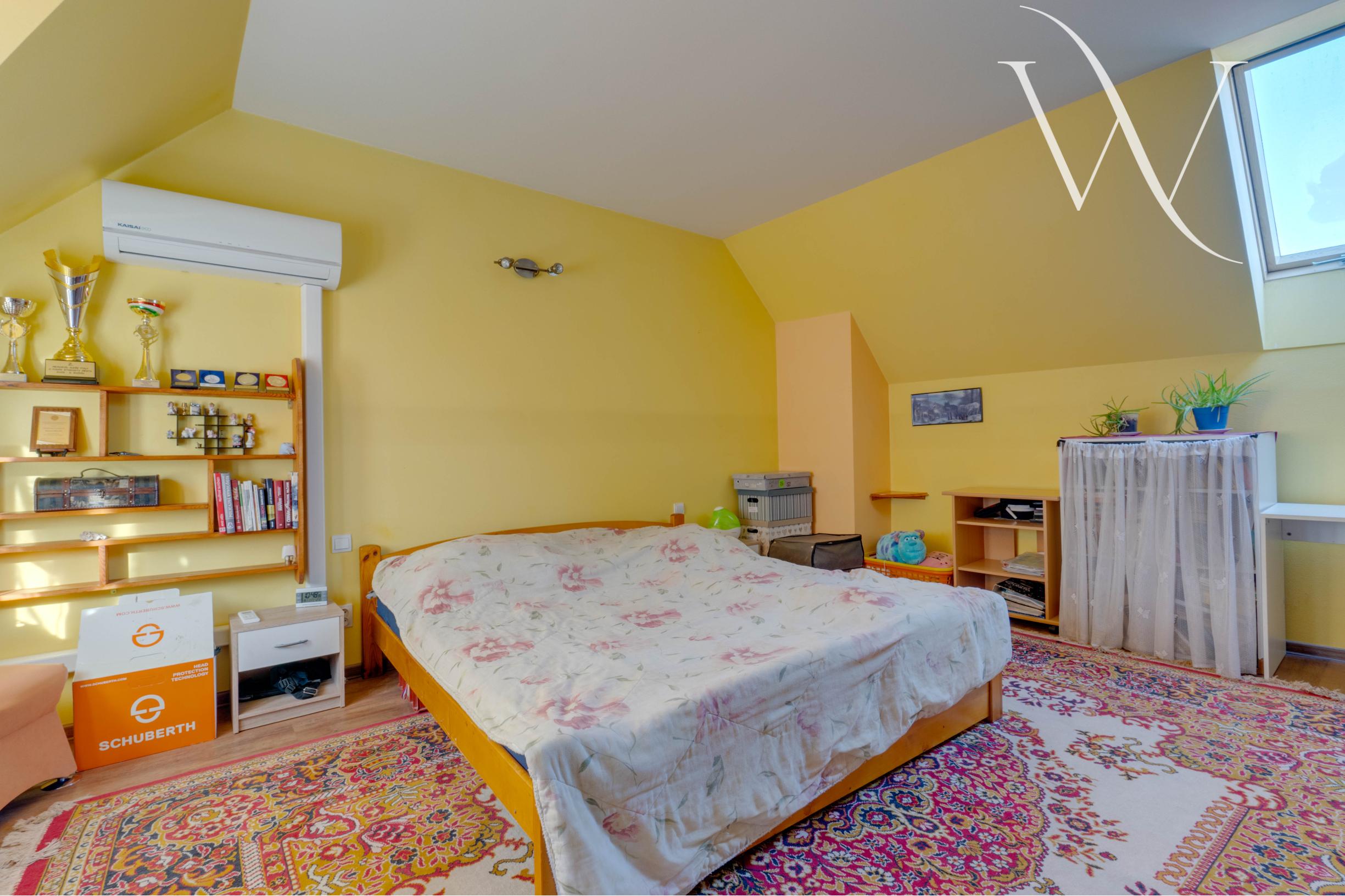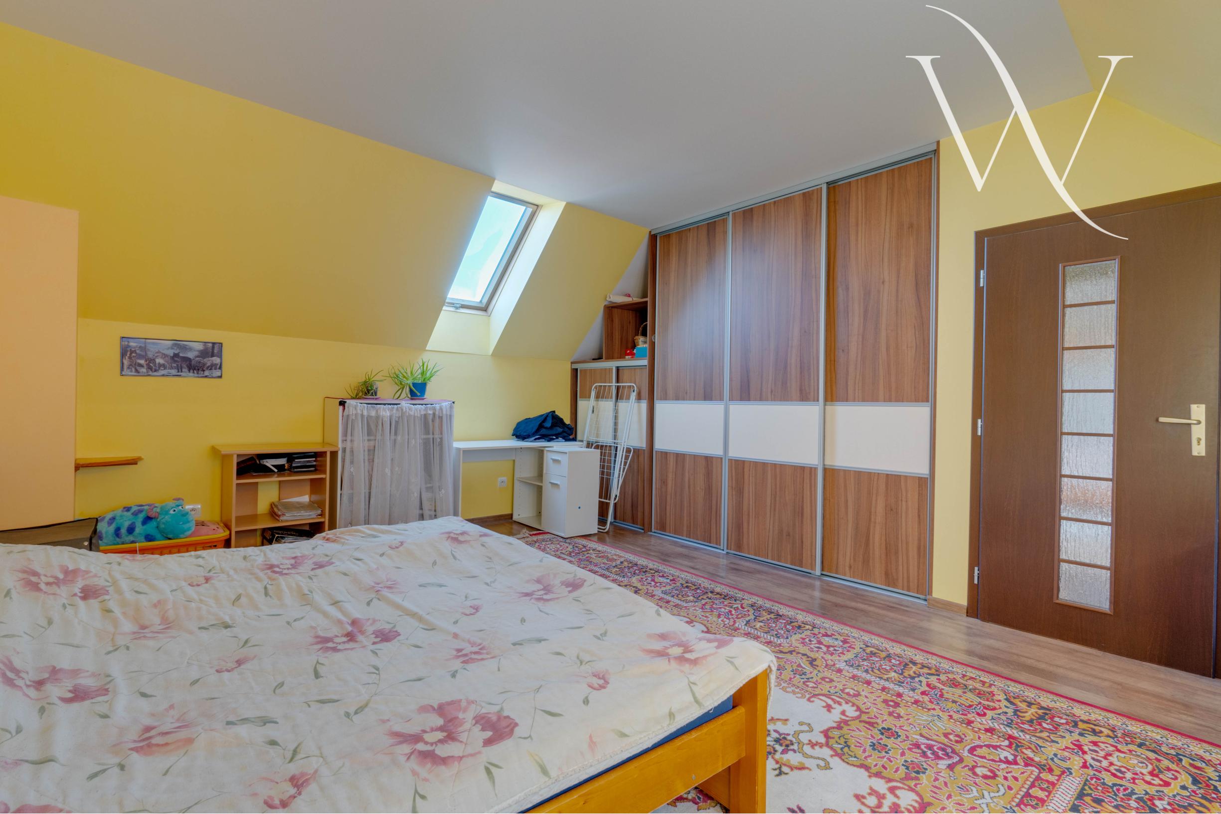 2. NP (59 m²): Dreveným schodiskom sa dostaneme do chodby, ktorá spája dve samostatné izby – priestranná spálňa s veľkým rolldorom a druhú izbu, ktorú je možné využiť ako detskú izbu alebo pracovňu.