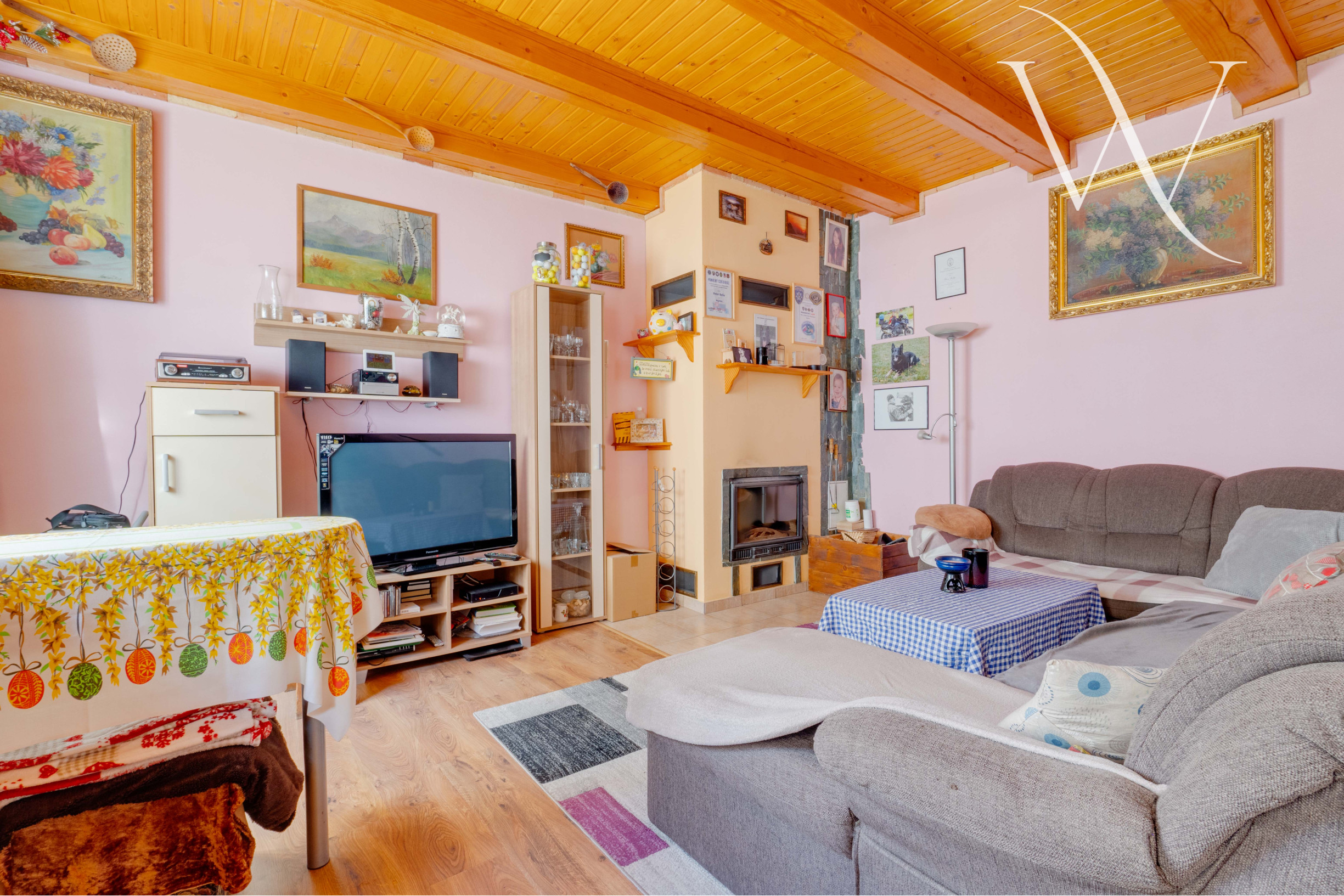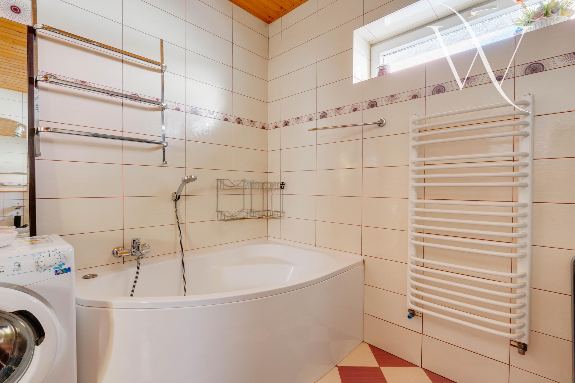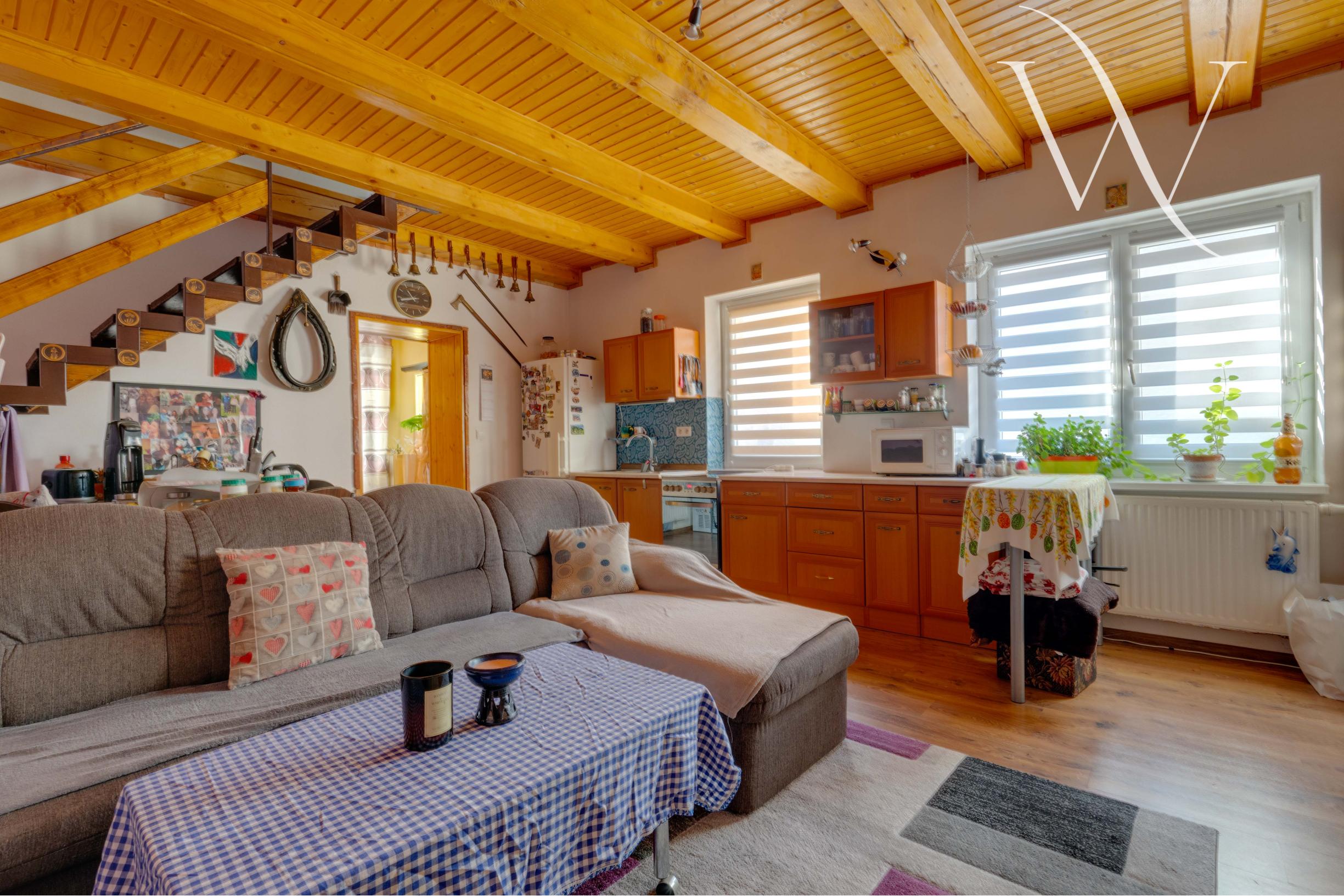 1. NP (59 m²): Vstupná chodba vás vedie do priestrannej obývačky s krbom, ktorý dodáva priestoru teplo a charakter, s otvoreným prepojením na kuchyňu. Veľká kúpeľňa s rohovou vaňou, sprchovým kútom a WC ponúka komfort a pohodlie.
