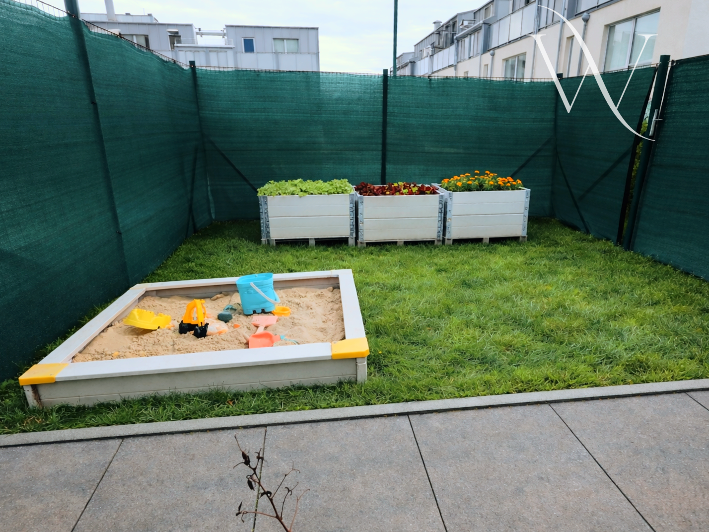 Na predzáhradke sa nachádza pieskovisko pre deti, vďaka čomu je byt ideálny pre rodiny. Tento priestor je zároveň veľmi vhodný aj pre zvieracích miláčikov, ktorým poskytuje bezpečný výbeh. Súčasťou exteriéru je aj praktický záhradný domček, ktorý slúži ako úložný priestor na náradie, sezónne veci alebo veci, ktoré nechcete skladovať v byte.