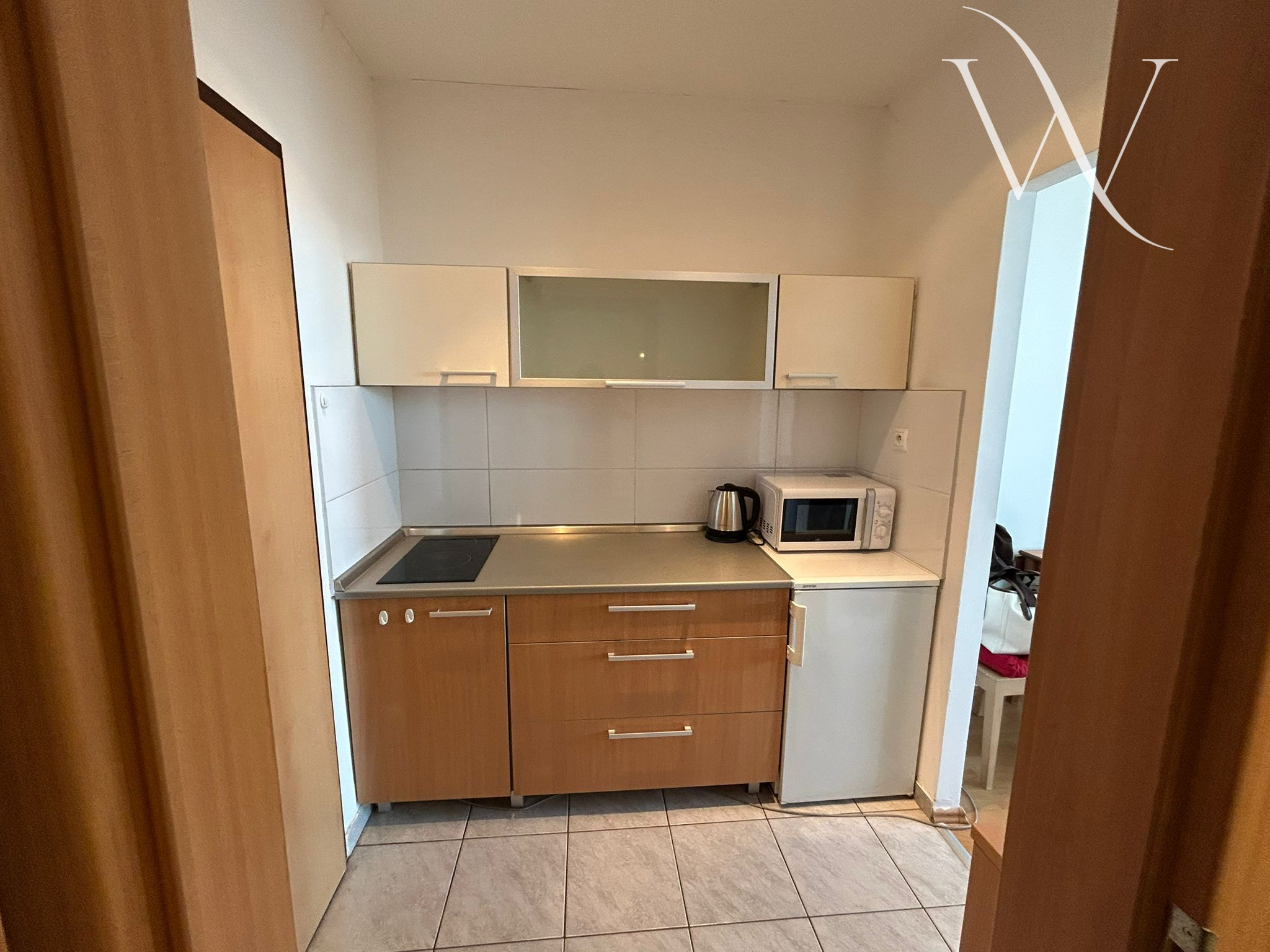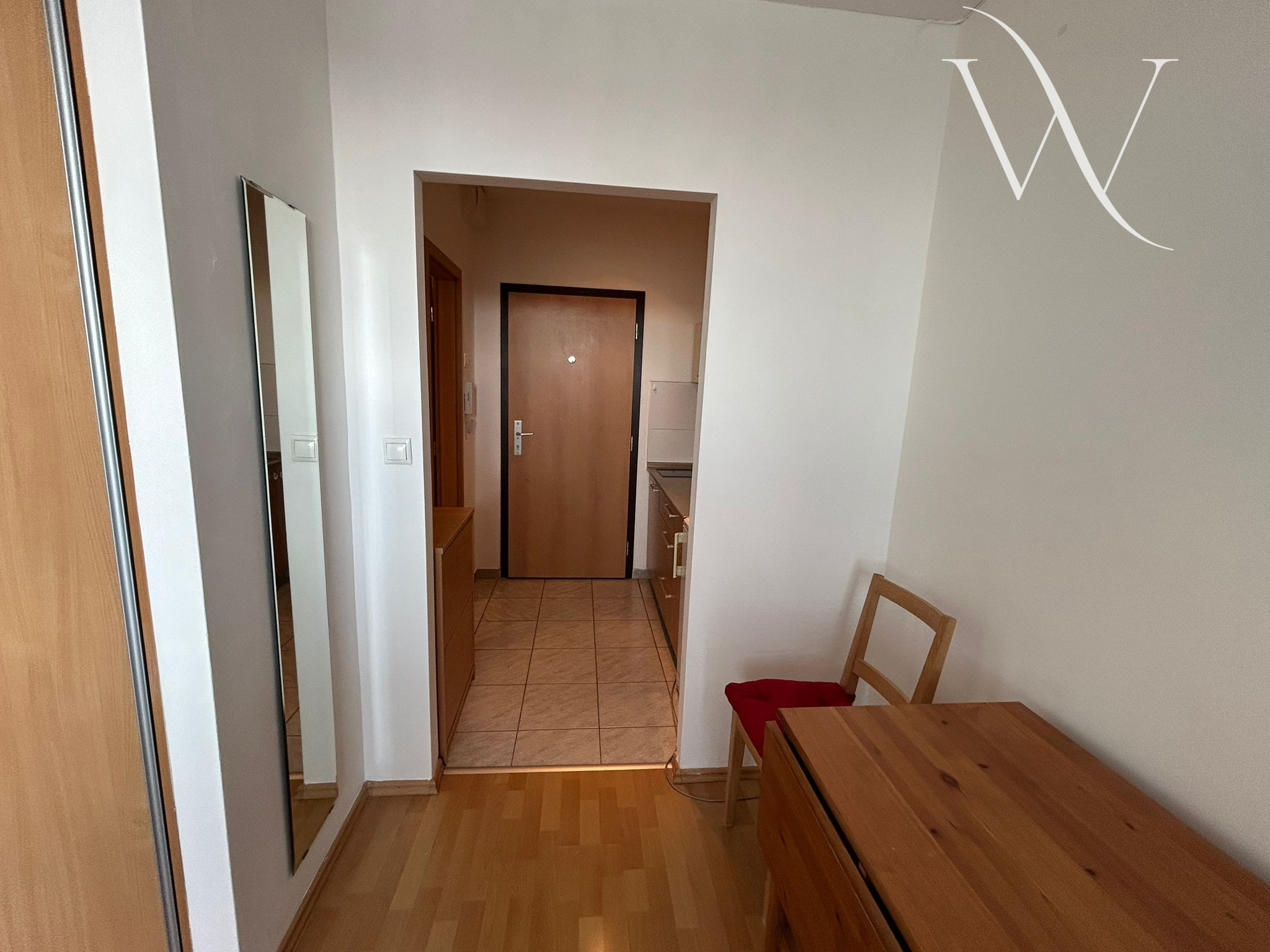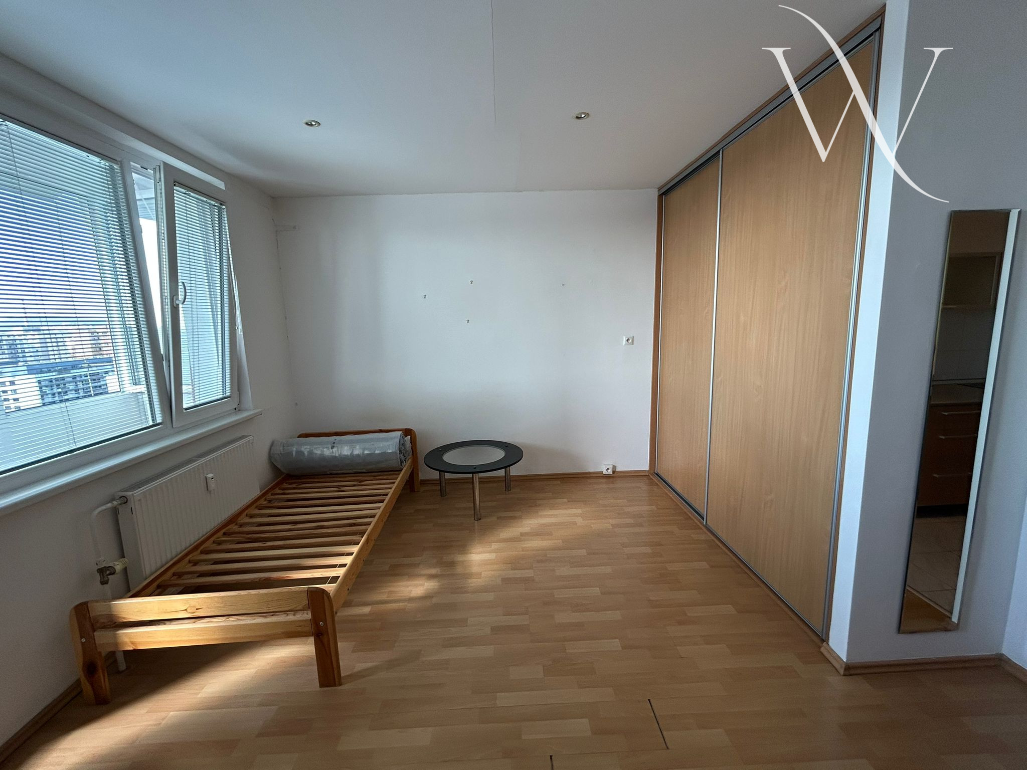 Garsónka sa prenajíma zariadená – k dispozícii je posteľ s matracom (pripravený na rozbalenie), rolldor, stôl, stoličky a komoda. Osvetlenie je riešené modernými bodovými svetlami.