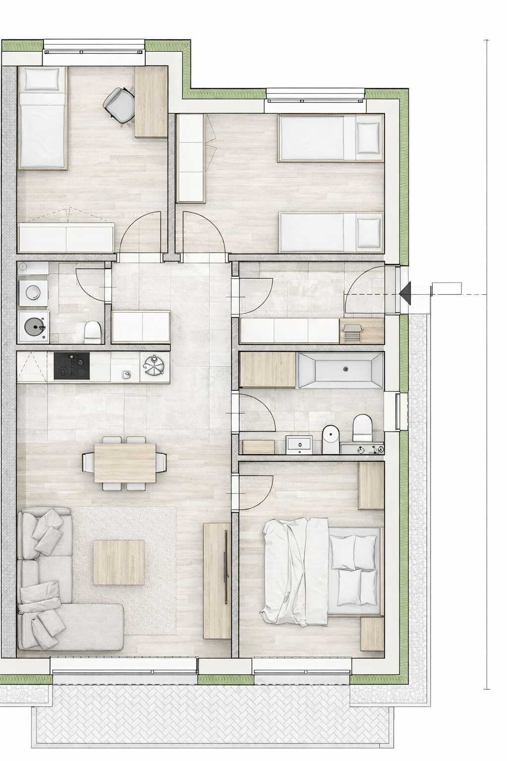 Dom disponuje premyslenou dispozíciou, každý meter štvorcový je využitý naplno, čo zabezpečuje maximálny komfort bývania bez zbytočných nevyužitých priestorov. V dome sa nachádza vstupná chodba s priestorom na vstavanú skriňu alebo botník. Dominantou domu je obývacia izba prepojená s kuchyňou a jedálňou s priamym výstupom na terasu, ideálna na oddych či rodinné stretnutia. Nočnú časť tvoria tri samostatné izby, pričom hlavná spálňa ponúka komfort v podobe vlastného šatníka, ktorý zabezpečuje dostatok úložného priestoru a zároveň zvyšuje celkový komfort bývania. Z hlavnej spálne je taktiež priamy výstup na terasu. Ďalej sa v dome nachádza kúpelňa s toaletou, v ktorej sa nachádza ako sprchový kút tak aj vaňa. Spojenie oboch prvkov prináša maximálny komfort – rýchle sprchovanie počas bežného dňa aj možnosť relaxu vo vani po náročnom dni. Veľkým benefitom je aj samostatná technická miestnosť, ktorá poskytuje praktický priestor pre technológie domu, uskladnenie a priestor pre práčku so sušičkou.