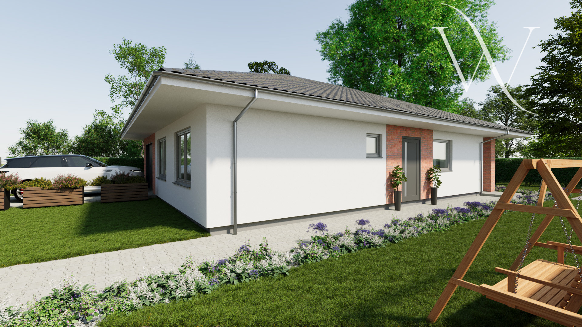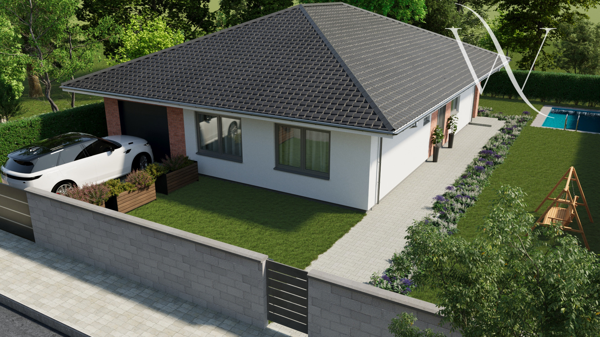 Parkovanie je zabezpečené pre tri vozidlá – jedno v garáži a dve na vonkajších parkovacích státiach, s možnosťou rozšírenia. Pozemok bude upravený a oplotený z troch strán.