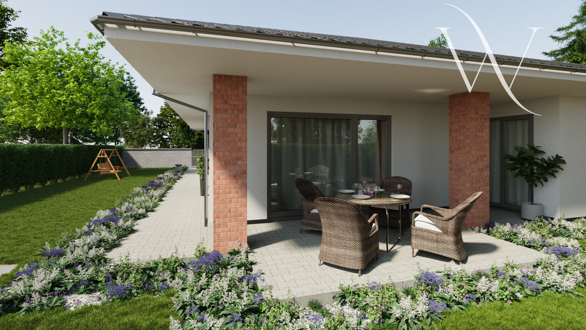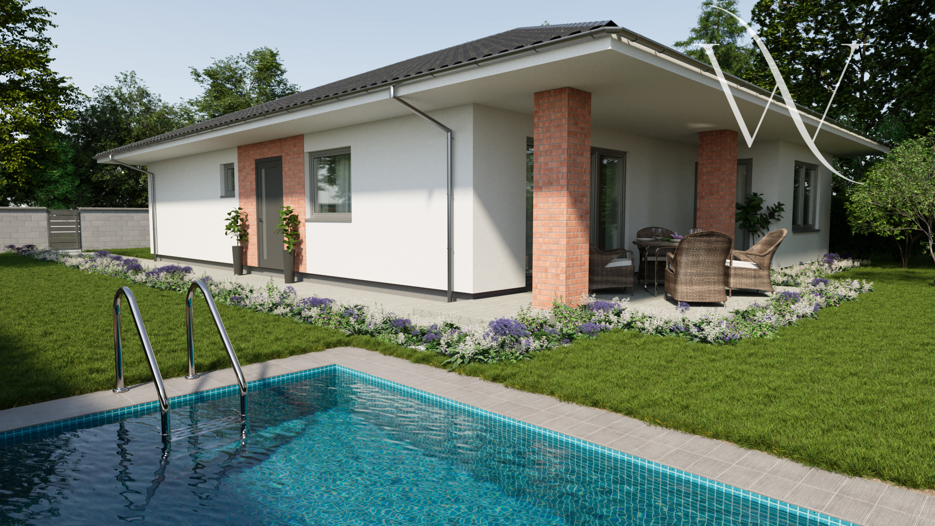 Dispozične dom ponúka priestrannú a svetlú obývaciu izbu prepojenú s kuchyňou a jedálenskou časťou, s priamym vstupom na krytú terasu. Hlavná spálňa má vlastný šatník a kúpeľňu s toaletou. Ďalej sa v dome nachádzajú dve samostatné izby, druhá kúpeľňa s toaletou, technická miestnosť a komora. Nehnuteľnosť disponuje garážou s priamym vstupom do interiéru cez technickú miestnosť. Garáž je vykurovaná a odvetrávaná, pričom ponúka aj potenciál budúcej transformácie na komfortný obytný priestor.