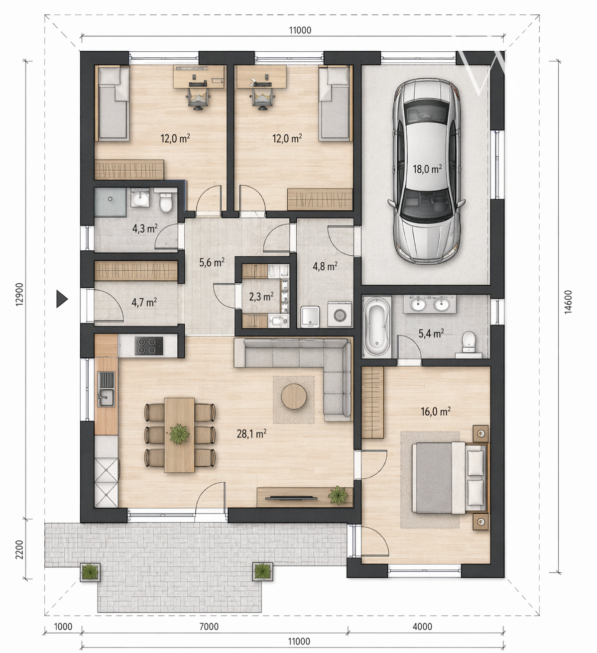Parkovanie je zabezpečené pre tri vozidlá – jedno v garáži a dve na vonkajších parkovacích státiach, s možnosťou rozšírenia. Pozemok bude upravený a oplotený z troch strán.